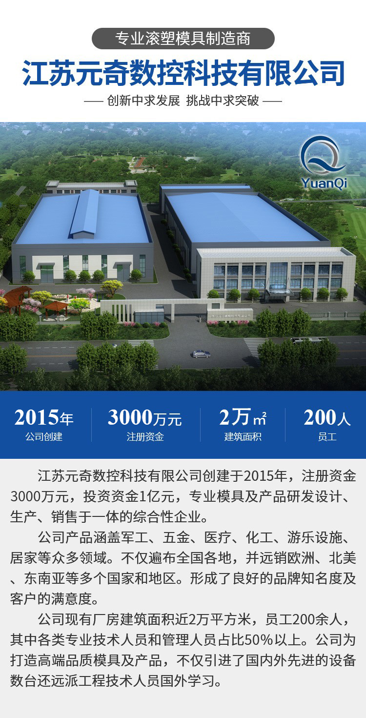 Jiangsu YuanQi CNC Technology Co., Ltd. was established in 2015. The marketing center is located in Shanghai and Zhejiang province of china. The production base is located at No. 68, Nanyuan Avenue, Environmental Science and Technology Park, Tangyang Town, Dongtai City, Yancheng City, Jiangsu Province (near Nantong City, Jiangsu Province). Registered capital over 30 million RMB, investment capital over 100 million RMB, We are comprehensive enterprise integrating R&D, design, production and sales of professional molds and products.